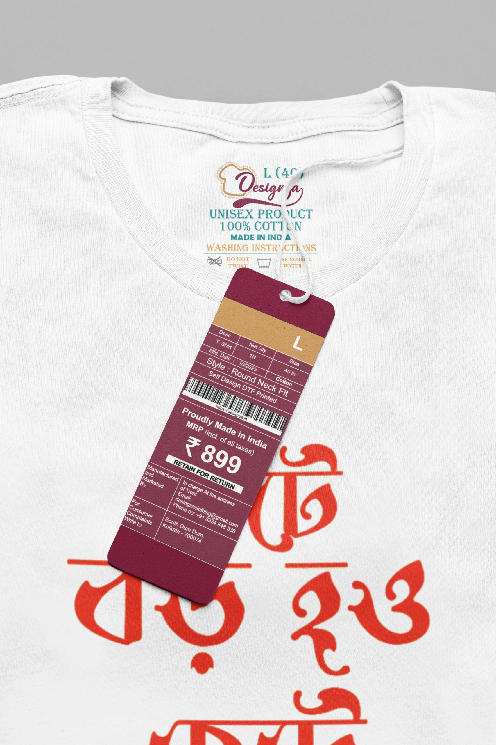 Designza Unisex White 100% Cotton T-Shirt White Round Neck with Bengali Script Graphic Print Price range: ₹448.00 through ₹488.00
